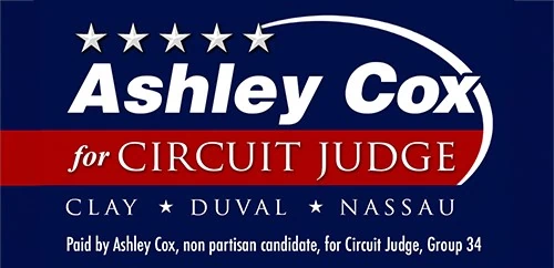 About Ashley Cox for Circuit JudgeAshley Wells Cox is running for Circuit Court Judge in Clay, Duval and Nassau counties. Ashley graduated magna cum laude from Duke University in 1997. She graduated from Northwestern University School of Law in the top 10% of her class. She is a former prosecutor and has practiced at the Bedell firm since 2006 focusing on criminal defense, administrative law, representing clients before The Florida Bar and family law. The election is August 20th.